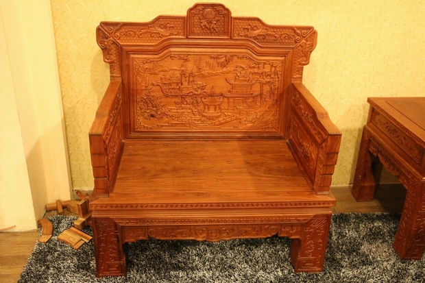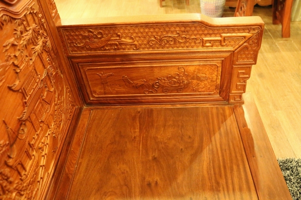 沙發(fā)的座椅面平整光滑,極盡原木材質(zhì)紋理之視覺感受;側(cè)面扶手處無(wú)任何鏤空面積之留飾,嚴(yán)實(shí)而框整,整體框架為矩形外觀設(shè)計(jì)。扶手上端正反兩面位置處,同樣雕繪有上處靠背板處鳳凰圖案形狀之紋飾,扶手底部正反兩面位置則雕繪有一些商周時(shí)期使用的器具,如斟酒器、編鐘等。
